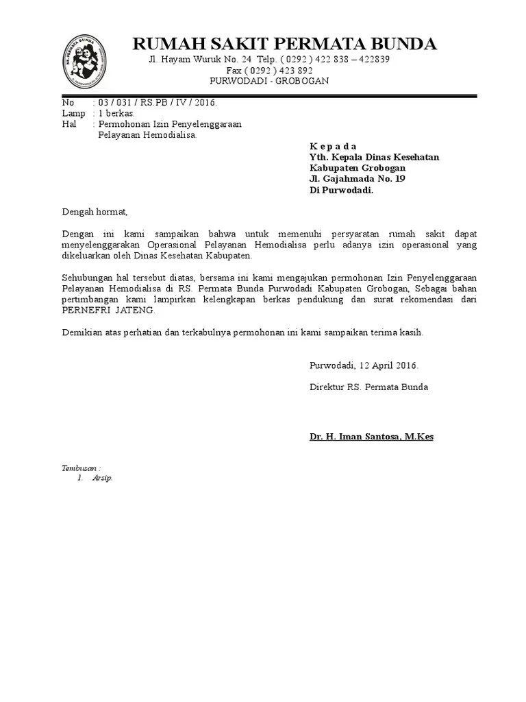 Jul 31, 2019 · volume maksimum ini dimaksudkan agar rumah sakit mempunyai upaya untuk menghemat pemakaian air agar ketersediaannya tetap terjamin tanpa mengorbankan kepentingan pengendalian infeksi. Demikianlah beberapa ulasan artikel tentang contoh surat permohonan perpanjang lisensi yang dapat anda jadikan referensi untuk mengetahui lebih jauh mengenai contoh surat permohonan perpanjang lisensi. Contoh surat permohonan dinas pendidikan kesehatan. Itulah surat permohonan kerjasama dengan rumah sakit yang dapat admin kumpulkan. Demikianlah permohonan ini saya sampaikan, atas perhatiannya diucapkan terima kasih. Itulah beberapa contoh surat permohonan untuk berbagai kepentingan yang dapat kamu jadikan rujukan dalam membuat … Contoh surat rasmi memohon cuti contoh surat rasmi terbaik. Sehubungan dengan kegiatan penyelenggaraan pendidikan dan pelatihan kursus yang diselenggarakan oleh lembaga lppk putra mandiri maka untuk kelancaran dalam pelaksanaan program kerja yang … Saya telah membaca semua persyaratan dan bersedia memenuhi semua ketentuan perusahaan, termasuk menjalani masa intership selama 6 (enam) bulan dan bekerja dalam sistem full time (waktu penuh). 08/01/2018 · 13 contoh surat permohonan untuk berbagai keperluan lengkap. 16/09/2019 · inilah rekomendasi tentang surat permohonan perpanjangan ijin operasional sekolah. Piagam perpanjangan ijin penyelenggaraan sekolah yang terakhir. 03/11/2020 · dengan ini bermaksud mengajukan permohonan magang kerja di pt rumah sakit berlian untuk posisi sebagai human resource (hr) admin.
